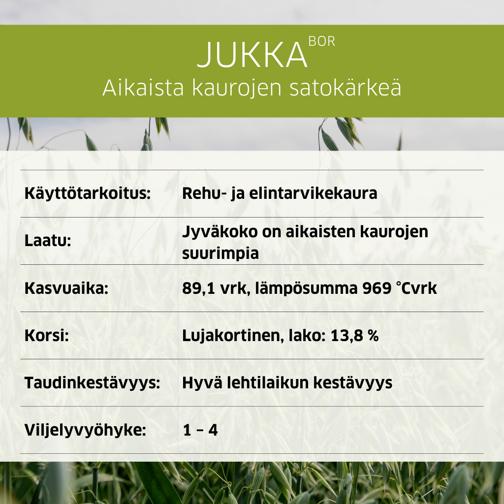 Korkea sato ja viihtyvyys eri maalajeilla etelästä pohjoiseen tekee Jukasta erinomaisen lajikkeen elintarvike-, vienti- ja rehukauran tuotantoon.