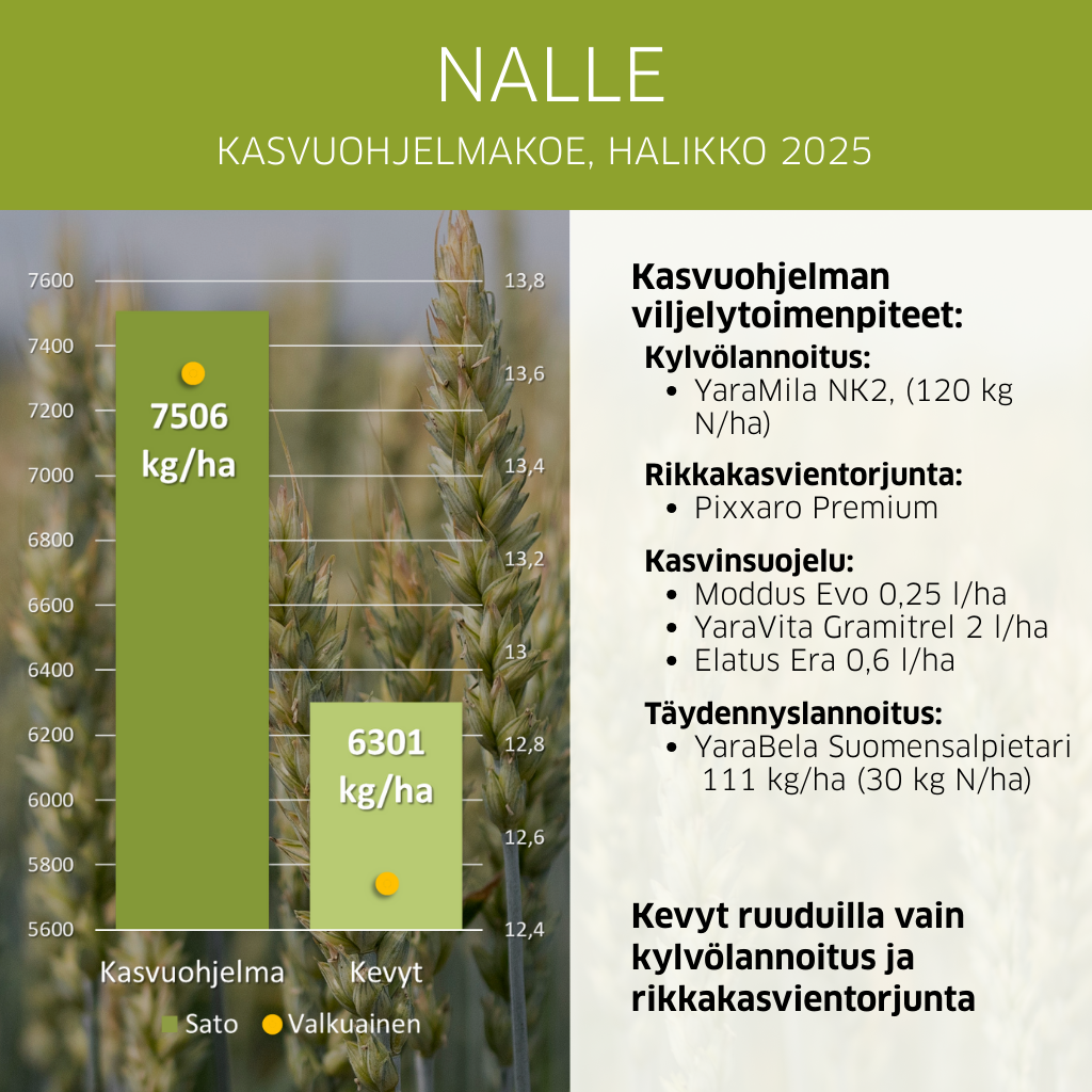 Erittäin korkea sadontuottokyky ja erinomainen laatu: valkuaispitoisuus 13,2 %, korkea hlp, sako 240. Nalle -vehnällä pystytään tuottamaan laadukasta myllyvehnäsatoa.