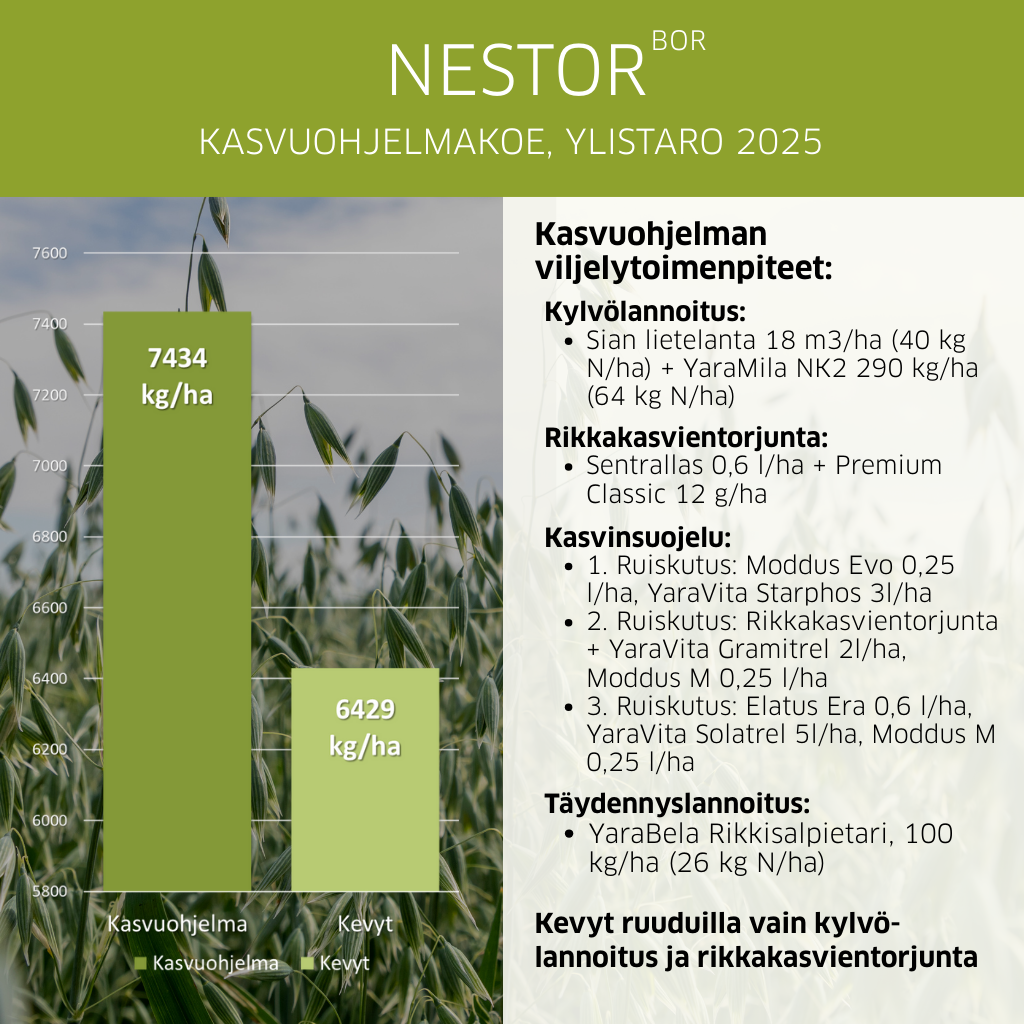 Virallisissa lajikekokeissa vuosina 2020 ja 2021 NestorBOR oli satoisin tai yksi satoisimmista lajikkeista kaikilla maalajeilla, viljelyvyöhykkeillä ja satotasoilla. Nestorilla onkin erityistä haastavien olojen kestävyyttä, mikä on tullut esiin etenkin alhaisen satotason kokeissa kuivissa ja helteisissä oloissa.