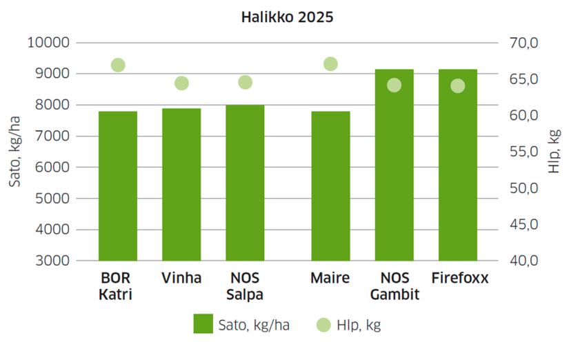 Myös NOS Gambit ylitti RGT Planetin sadon yli 800 kilolla. Uusien lajikkeiden tuhannen jyvän painot olivat noin 5 g suuremmat kuin mittarilajikkeella.