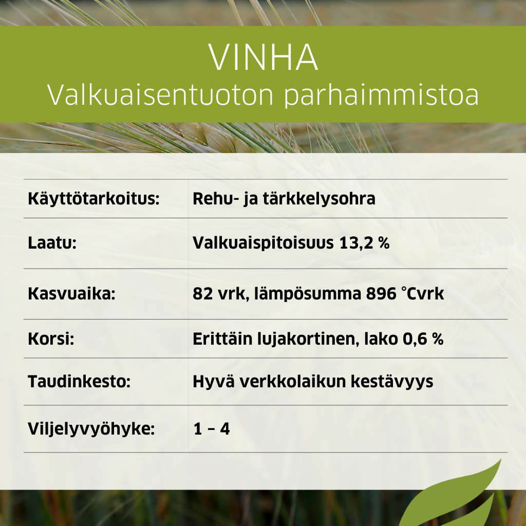 - Suurijyväinen, korkea valkuaispitoisuus (13,2 %)