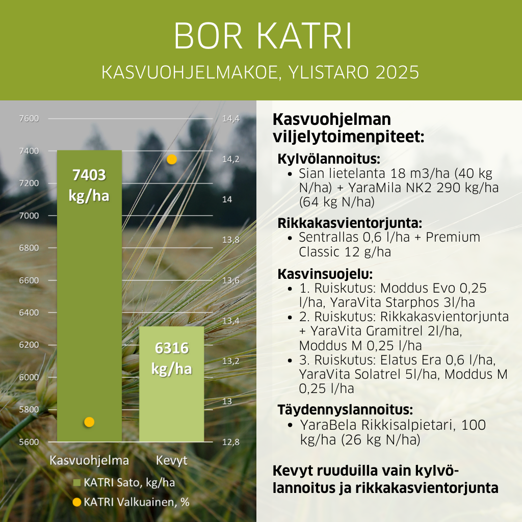 BOR Katrin valkuainen on satotaso huomioiden korkea ja tärkkelyspitoisuus aikaiseksi monitahoiseksi ohraksi hyvällä tasolla. BOR Katri soveltuu hyvin rehu- ja tärkkelysohraksi.