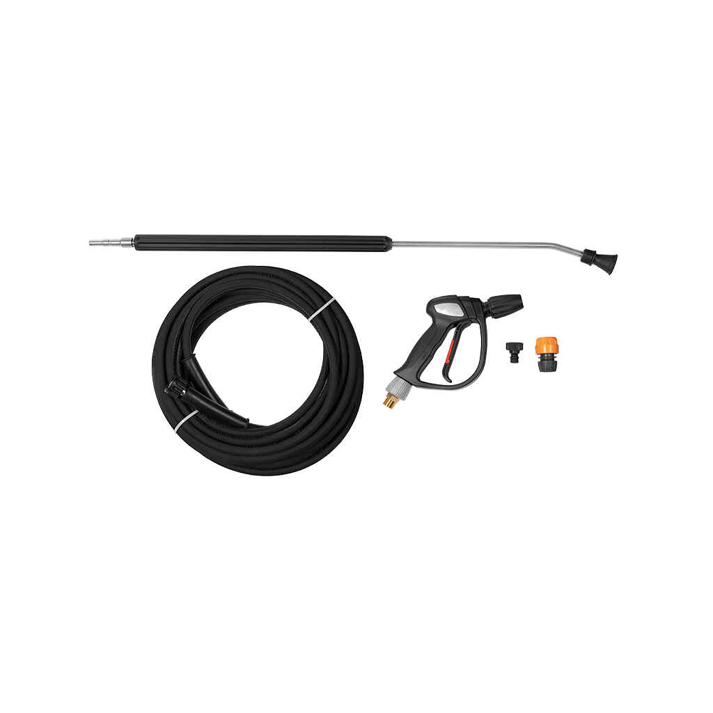 -Vakiovarusteet: Pesukahva pyörivällä liittimellä ja pikaliittimellä, eristetty teräksinen suutinputki, 15° viuhkasuutin, teräsvahvistettu kumipaineletku 15 m, tulovesiliitin, tulovesisuodatin ja suomenkielinen ohjekirja.