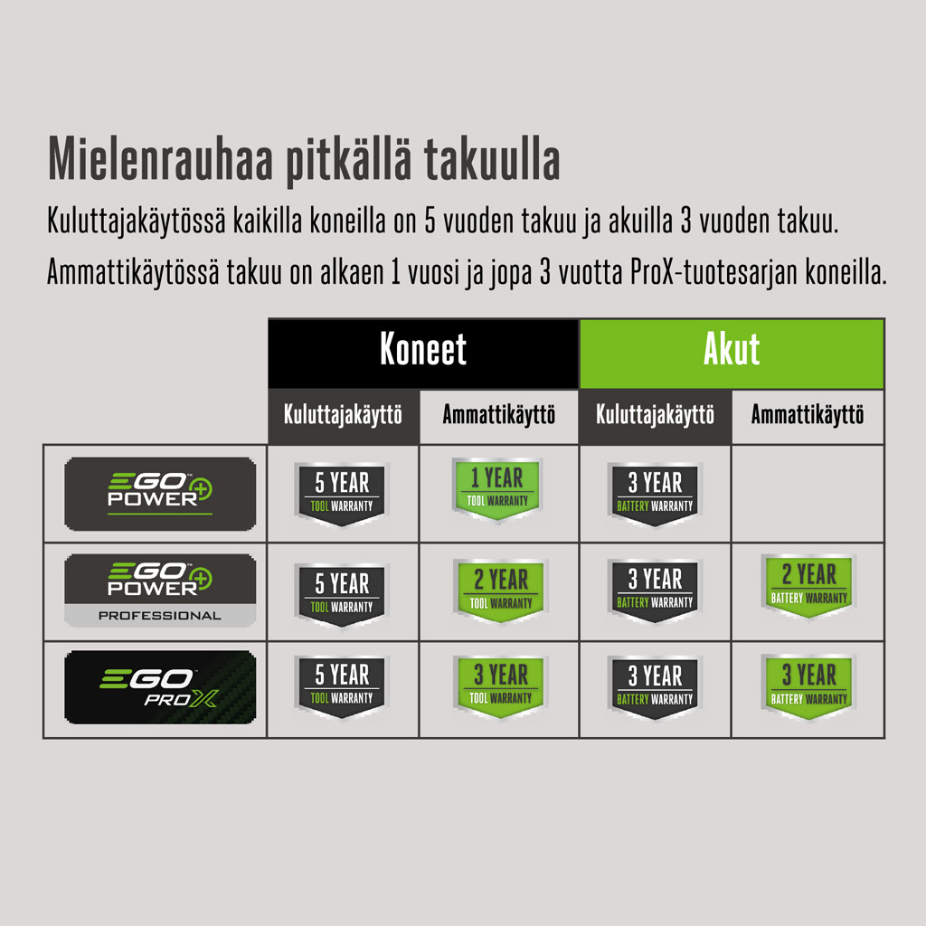 EGO CBA0240 on 2,0 Ah/12 V akku, joka on yhteensopiva EGO CHT2001E -nurmikko- ja pensasleikkurin kanssa.