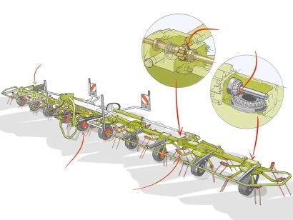 6-kulmainen nivelakseli siirtää voiman luotettavasti kaikille roottorikeskiöille. Luotettava öljykylpyinen vaihteisto minimoi kitkaa sekä osien kulumista.