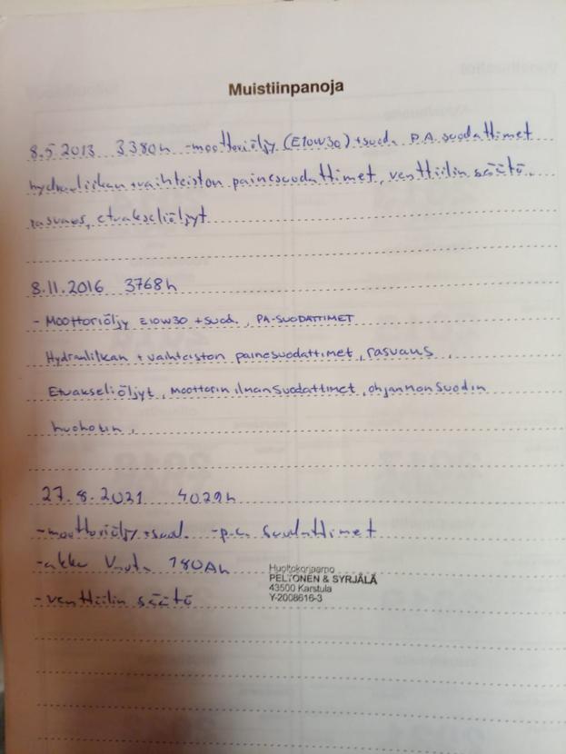"Monien mahdollisuuksien kone" niin metsään, kuin pellollekkin ! Tässä koneessa hyvä "Metsävarustus" JAKE:n pohjapanssaroinnilla ! Taakseajolaitteet, Lasinen kattoluukku, Nappikytkin ja 100% lukko etuakselilla ! Alla 14 kankaiset mesärenkaat ja peltohommiin levikkeet joka pyörään ! Uusi Ilmapenkki, Etulokausojat, Kolme hydrauliikkalohkoa ja vapaa paluu ! Traktori varustettu vuonna 2010 Nokan 5282 kuormaajalla JAKE:n takasiltasovitteissa ! Traktorissa lisäksi I-POWER hydrauliikan lisäpumpulla ja kuormaaja Hydraulisella esiohjauksella ! Kuormaajassa hydrauliset sammakkomallin tukijalat ja ulottuvuuttakin 8,2 metriin ! Traktorin perässä jämerä Tempon PK-10 ropsonivetoinen metsäkärry ! Kärryssä aisaohjaus, Jämäkkä etusermi, Neljä karikkaparia jatkeilla ja 420 R 16.5 rengastuksella ! Samaan kauppaan vielä hyvät 11mm ketjut takapyöriin, 400 litran urakkasäiliö ja paalipihdit kuormaajaan ! Traktori ensimmäiselltä omistajalta, aukottomalla huoltohistorialla ja todella hyvältä pidolta ! Kone vapaana Soinissa heti, kun Isäntä kerkee parissa päivässä keräilee, myrskyn kaatamat tuulikaadot pois ! Tästä kannattaa olla nopiaan yhteydessä myyntimieheen ? Suoraan edullisesti, tai vaihtaen sopivasti, kysy ? Kuten huoltomuistiinpanoista huomaa, niin koneen käyttö jäänyt viime vuosina varsin vähäiseksi ! Joitain varusteita jäi varmaan mainitsematta, mutta soita ja kysy myyntimieheltä ? Nouto onnistuu suoraan tilalta, tai tarvittaessa edulliset rahdit ympäri Suomen ? Myyntimiehen tavoitat P.050-3636439 / WhatsApp tai sähköpostilla: ano.halla-aho@hankkija.fi