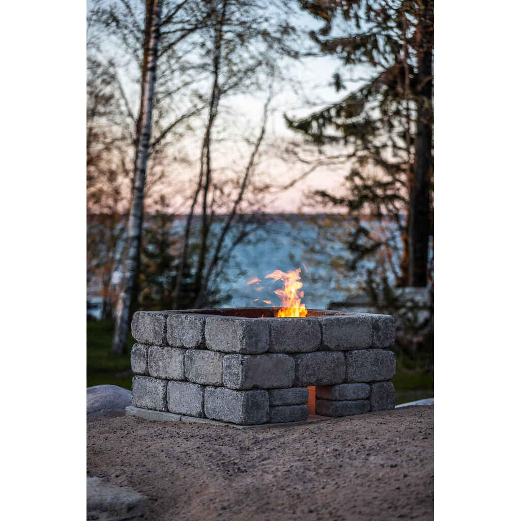HB-Firepit on moni-ilmeinen ja näyttävä tulisija useaan käyttötarkoitukseen. Firepit on helposti muokattavissa omien toiveiden ja mittojen mukaan. Kokonaisuus sisältää 28 isoa patinoitua muurikiveä ja 4 matalaa patinoitua muurikiveä.