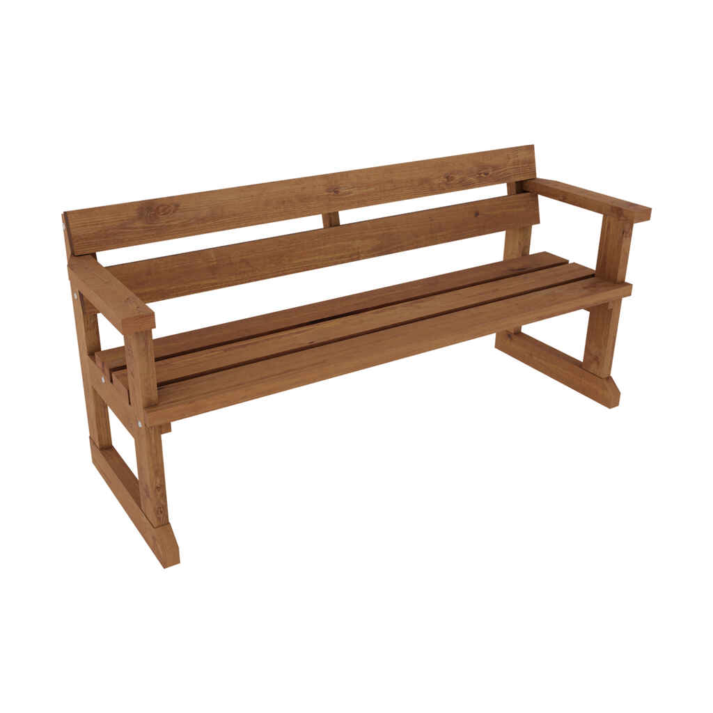 Selkänojallinen ja käsinojallinen puinen penkki. Sävytetty vesiohenteisella kuullotteella. Maatavasten tulevat osat kestopuuta. Istuin ja selkänoja myrkytöntä jämäkkää 40 mm havupuulankkua. Helppo koota. Mukana selkeät ohjeet. Avainlipputuote.