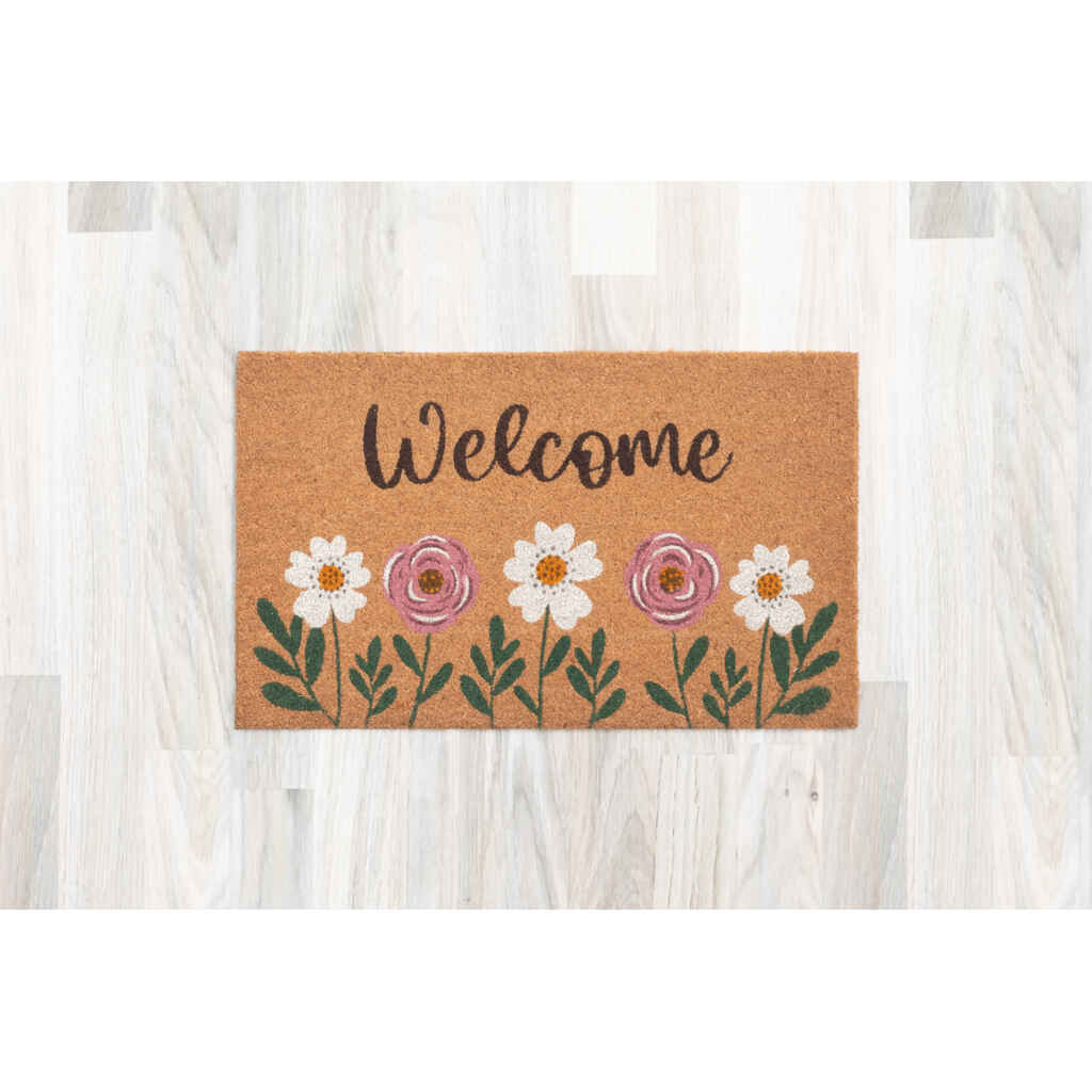 Kookoskuituinen ovimatto eli kynnysmatto kukkakuviolla. Ovimatto kerää tehokkaasti kenkien pohjissa kulkeutuvan lian ja pölyn. Koko 45 x 75 cm. Paksuus 16 mm. Materiaali kookoskuitu, vinyyli. Ravista, lakaise tai imuroi.