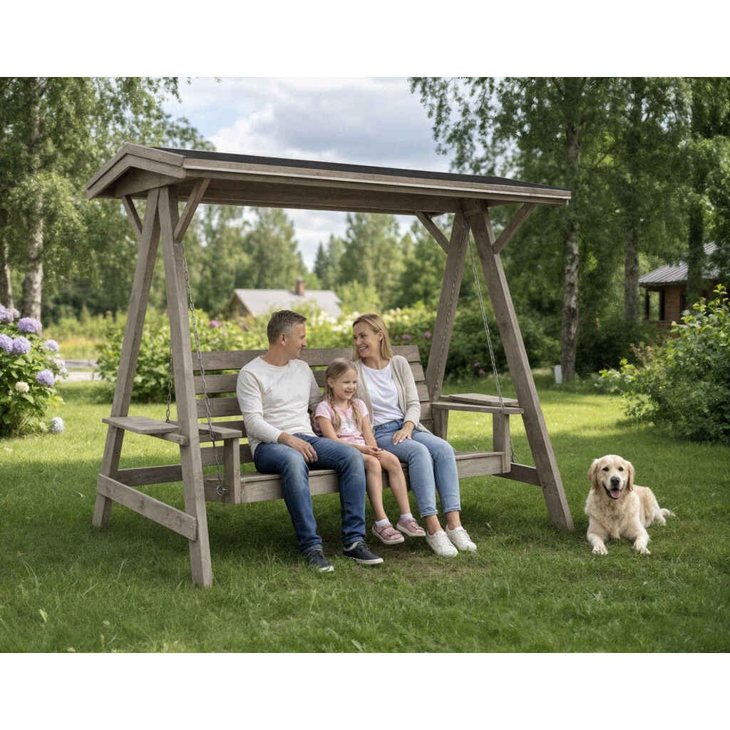 Kolmen istuttava pihakeinu kovalla katoksella. Suomalainen Avainlipputuote. Kaikki kiinnitykset ruuvein ja pultein. Reisilankut jämäkkää 40 mm havupuuta. Sävytetty vesiohenteisella kuullotteella. Sisältää bitumikatteen ja tippalistat.