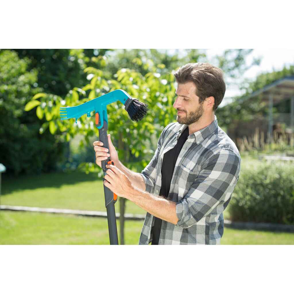 GARDENA combisystem -räystäskourun puhdistaja on ihanteellinen työväline, kun on aika puhdistaa ja tyhjentää vesikourut. GARDENA combisystem -työkaluperhe mahdollistaa työvälineiden ja varsien monipuolisen käytön vaihdettavien lisävarusteiden ansiosta. Myös räystäskourujen puhdistusharja on yhteensopiva kaikkien GARDENA combisystem -varsien kanssa, ja se voidaan kiinnittää tiukasti varteen kiinnitysruuvista pyörittämällä. GARDENA suosittelee combisystem-sarjan teleskooppivartta (viitenro 3271-20), jolla yltää jopa viiden metrin korkeuteen. Räystäskourun puhdistajan ja varren välinen vankka liitos takaa miellyttävän työskentelyn. Käytännöllinen kahva mahdollistaa työvälineen mukavan käytön myös ilman combisystem-vartta. Räystäiden puhdistaja on monikäyttöinen, sillä sen toisessa päässä on tukevat harjakset ja toisessa kaksi korkealaatuisesta muovista valmistettua vahvaa kaavinta. Integroitu Original GARDENA System -liitos mahdollistaa lisäksi puutarhaletkun kiinnittämisen työvälineeseen, jolloin kourujen puhdistaminen onnistuu myös vedellä. Pikalukitusvipu mahdollistaa käyttökulman yksilöllisen säädön. Erikseen saatavilla oleva combisystem Flex -työkaluteline (viitenro 3505-20) mahdollistaa tilaa säästävän säilytyksen. GARDENA combisystem -teleskooppivarrella on 25 vuoden takuu. Online-rekisteröinnin voi tehdä osoitteessa www.gardena.com/registration 3 kk:n kuluessa ostosta.