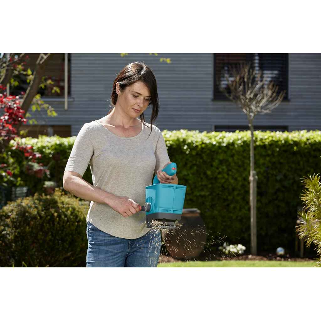 GARDENA-käsilevitin M sopii erinomaisesti esim. lannoitteiden, siementen ja maantiesuolan levittämiseen pienemmille alueille. Levitettävän materiaalin määrää voidaan muuttaa kätevästi ergonomiseen kahvaan sijoitusta säätimestä. Kannettava levitin toimii kampea pyörittämällä. Vapaasti pyörivä levy varmistaa luotettavan ja tasaisen levityksen. Levitin on valmistettu korkealaatuisesta muovista, mikä tekee siitä erityisen vankan. Levitysleveys 1-4 m, tilavuus 1,8 litraa.
