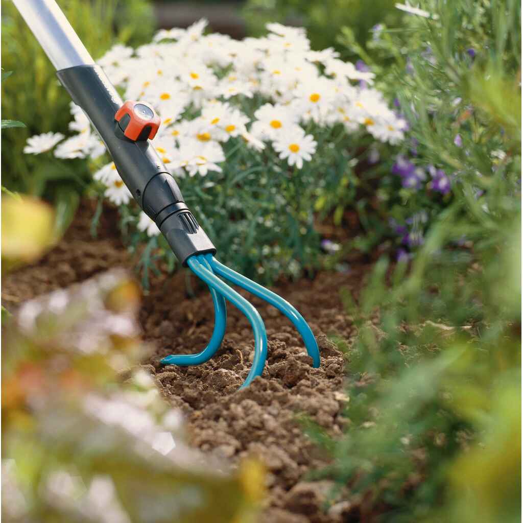 GARDENA combisystem -möyhentimen avulla voit helposti muokata pehmeää tai keskikovaa maata kolmen keihäänmuotoisen, puristetun piikin ansiosta. GARDENA combisystem -työkaluperhe mahdollistaa työvälineiden ja varsien monipuolisen käytön vaihdettavien lisävarusteiden ansiosta. Myös möyhennin on yhteensopiva kaikkien GARDENA combisystem -varsien kanssa, ja se voidaan kiinnittää tiukasti varteen. GARDENA suosittelee 130 cm pitkää vartta, mutta valinta riippuu työolosuhteista ja käyttäjän pituudesta. Möyhentimen ja varren välinen vakaa liitos takaa aina miellyttävän työskentelyn. Työleveys on 10 cm. Korkealaatuinen teräs ja Duroplast-pinnoite suojaavat laitetta korroosiolta ja tekevät siitä kestävän. Möyhennin voidaan myös säilyttää tilaa säästävällä tavalla esimerkiksi combisystem Flex-työkalutelineessä (viitenro 3505-20). GARDENA myöntää combisystem-tuotteille 25 vuoden takuun. Online-rekisteröinnin voi tehdä osoitteessa www.gardena.com/registration 3 kk:n kuluessa ostosta.