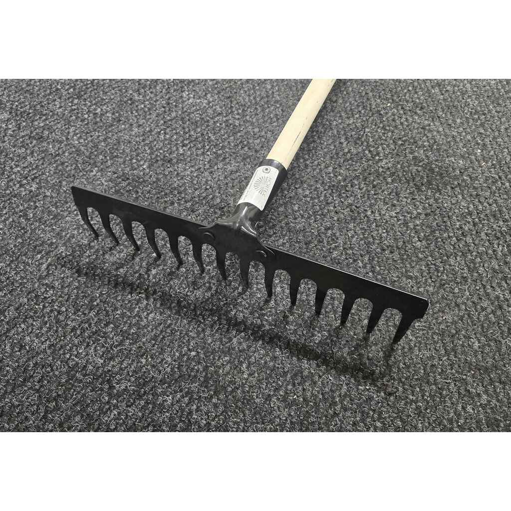 Kestävä 14-piikkinen rautaharava tukevalla puuvarrella. Varren pituus 145 cm, haran leveys 35 cm.