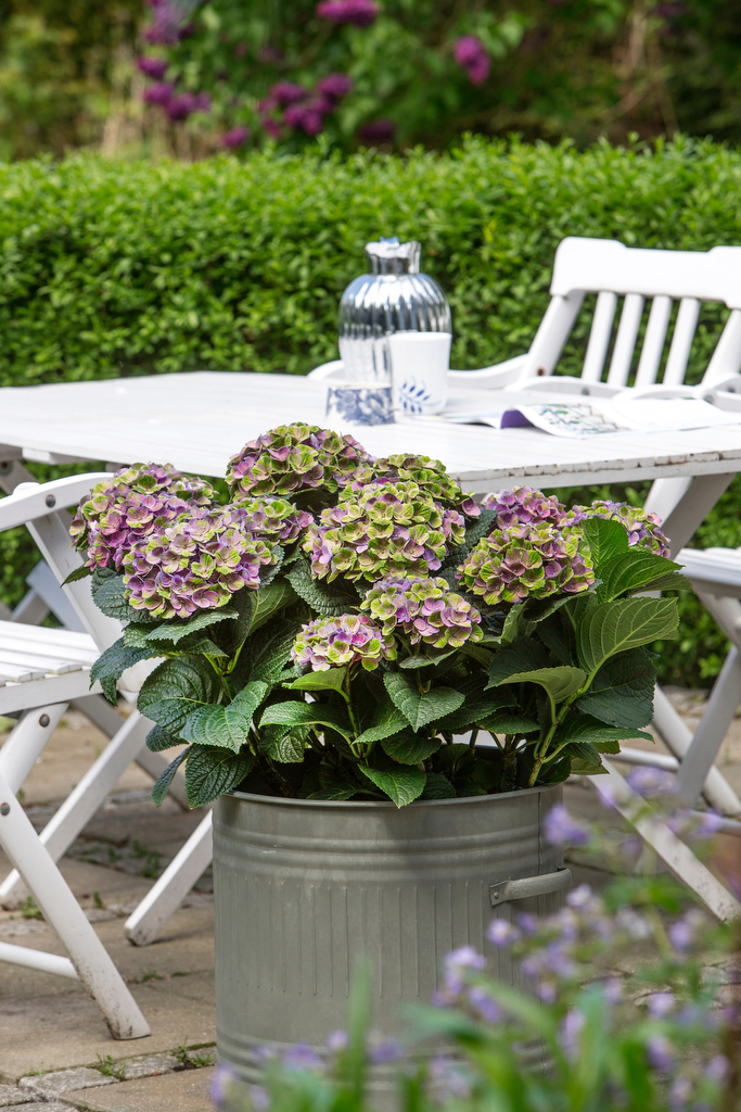 Kaunis ruukkuhortensia kukkii pitkään samoilla kukilla. Hortensia viihtyy valoisalla paikalla, mutta ei suorassa auringonpaahteessa. Tasainen kastelu ja lannoitus takaavat näyttävän kukinnan koko kesän. Hortensia ei kestä kuivuutta ja kukkii paremmin hieman viileässä paikassa.