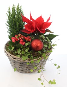 Joulutähti -istutuksessa lisäksi havu, tulilatva sekä lankaköynnös ja koriste.