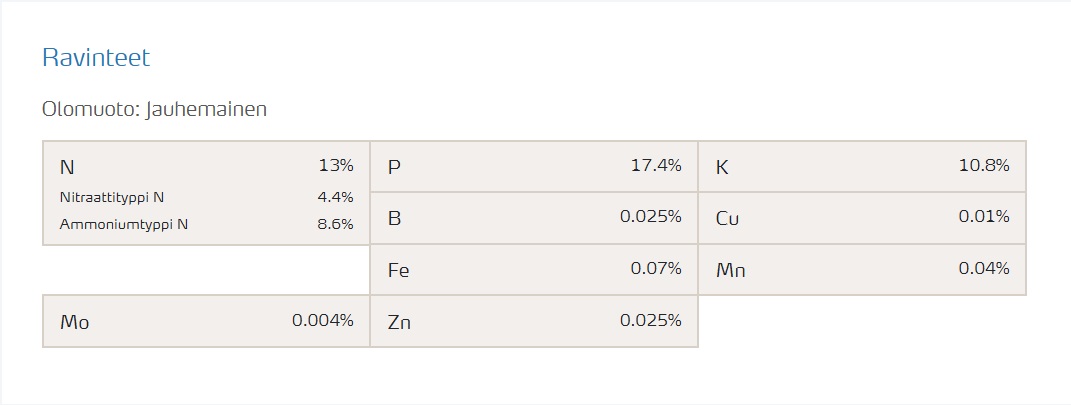 N: 13% (Nitraattityppi N 4.4%, Ammoniumtyppi N 8.6%)