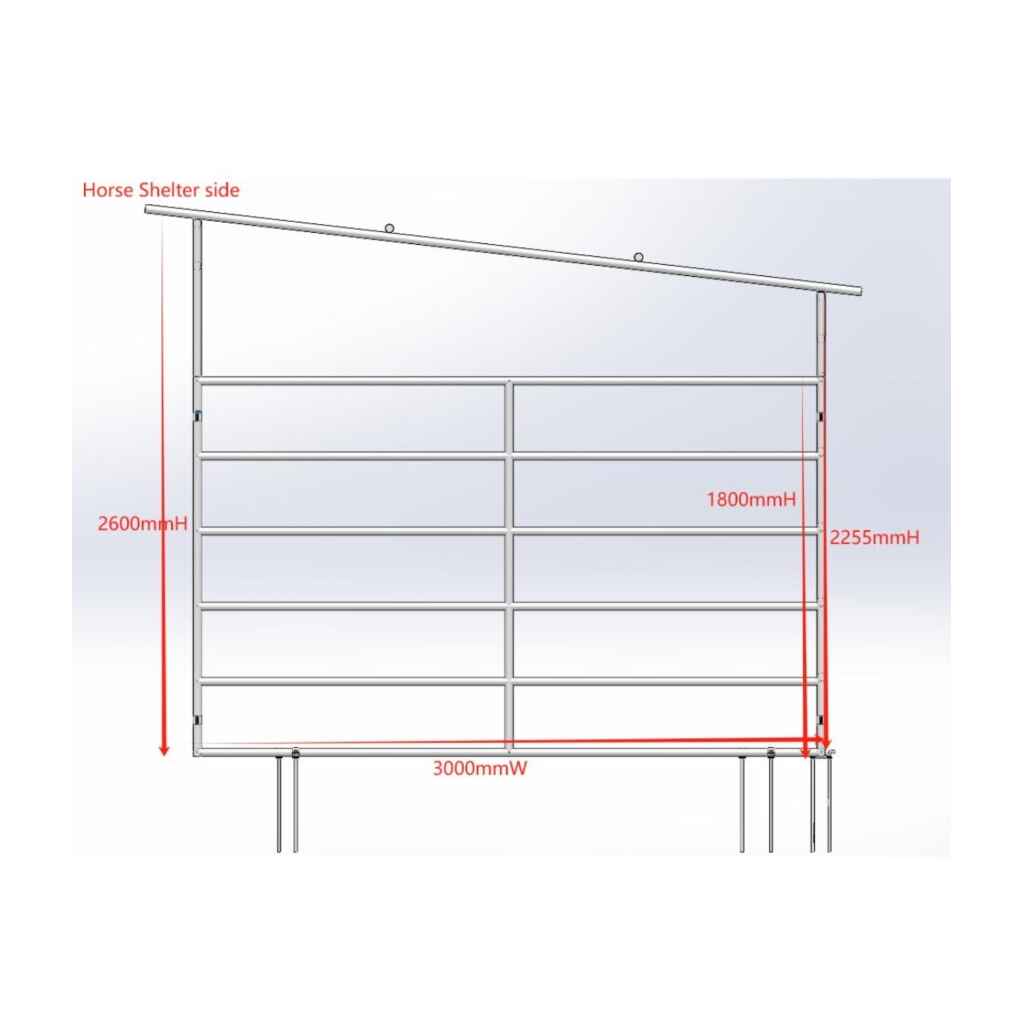 Reilun kokoinen tuulensuojakatos, johon mahtuu isompikin hevonen. Sisäpuolen seinät sinkitystä putkesta ja pintamateriaalina kestävä pressu. Toimitetaan osina. Seinäelementit ovat kokonaisina, mikä takaa katoksen tukevuuden.