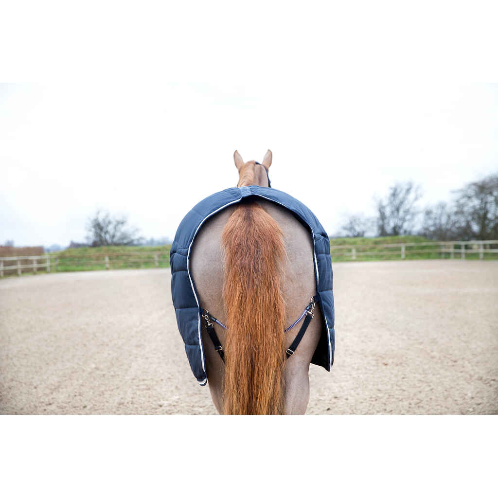 Tämä B Vertigo Corey talliloimi huokuu eleganssia. Mustanpuhuva, tikattu ja keskipaksulla, 250g toppauksella varustettu talliloimi on viimeistelty kontrastia tuovilla kanttinauhoilla. Vedenpitävä ja hyvällä toppauksella oleva talliloimi pitää hevosesi lämpimänä tallissa. Vedenpitävän pintakankaan ansiosta kosteus tai kuivikkeet eivät tartu loimen pintaan, joten se pysyy siistinä myös aktiivisemman hevosen yllä. Talliloimen päällikangas on käyttöä kestävää 600 denierin Ripstop -kangasta. Loimessa on T-solkikiinnitys edessä, ristimahavyöt sekä klipseillä kiinnitettävä, kumipäällysteinen häntälenkki ja irrotettavat jalkalenkit. Materiaali: päällikangas 600 denierin Ripstop-kangasta. Vuori 210T:n polyesteri. Toppaus 250g polyfill-täyte.