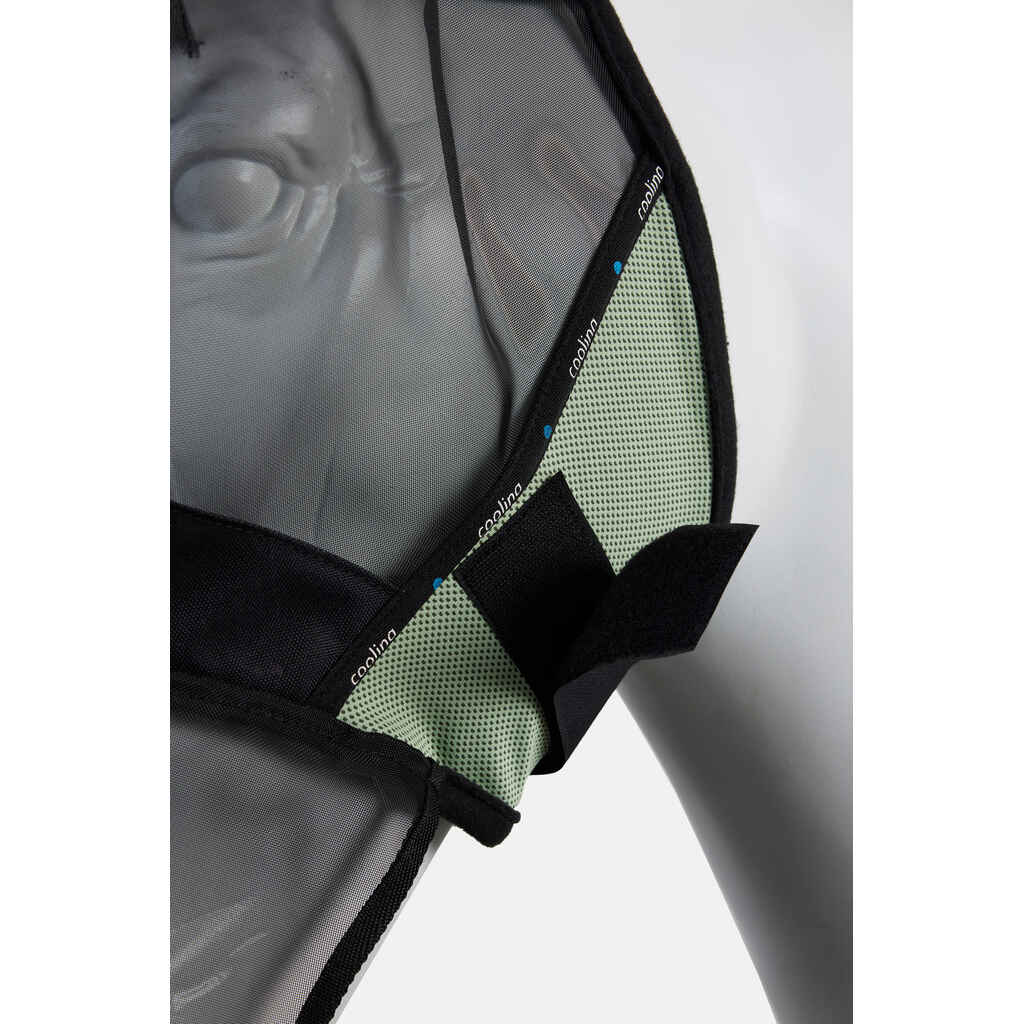 Tämä viilentävä ötökkähuppu pitää hevosesi olon miellyttävänä ja hyönteiset loitolla kesällä. Korvien, etuosan ja sivujen hengittävä verkkomateriaali varmistaa ilmankierron, kun taas korvia ympäröivä fleece on pehmeän miellyttävää. Turvalliset tarrakiinnitykset. Sivuilla olevat logonauhat antavat maskille sporttisen ilmeen.