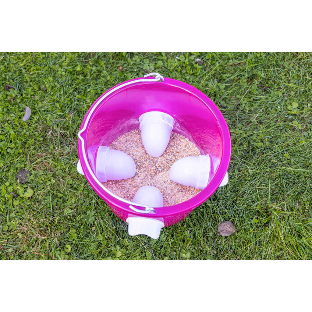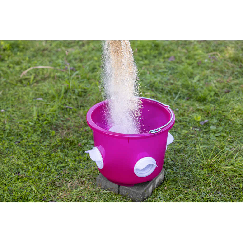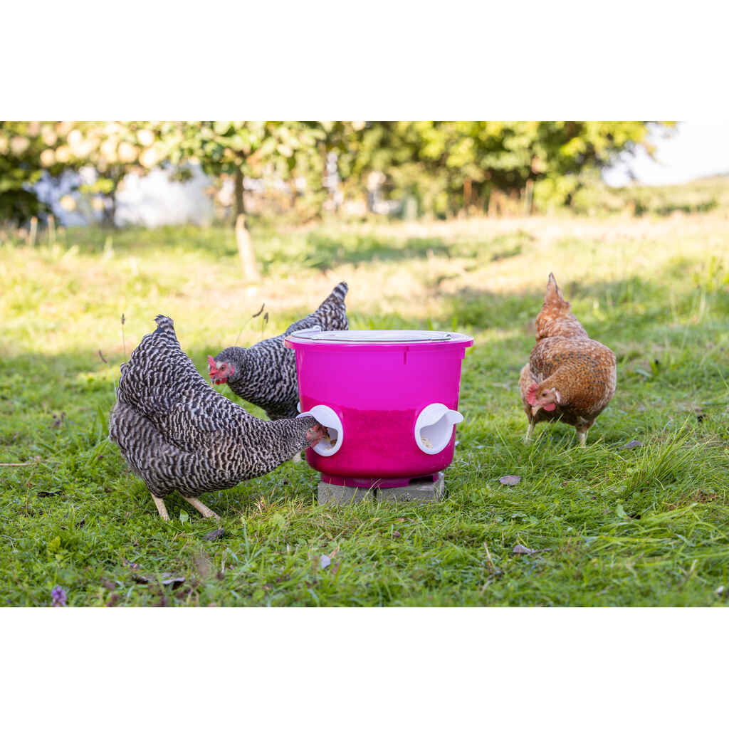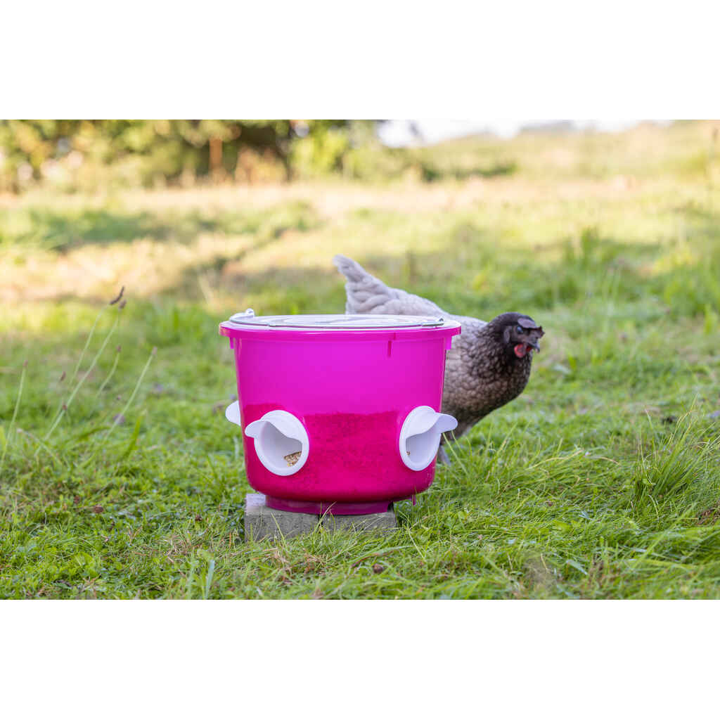 Käytännöllinen ja kestävä ruokinta-automaatti harrastekanaloihin ja pienille kanaparville. Neljä ruokinta-aukkoa mahdollistavat useamman kanan samanaikaisen ruokinnan ja vähentävät tungosta. Suojakansilla varustetut aukot suojaavat rehua lialta ja estävät rehun kuopimisen automaatista, mikä parantaa hygieniaa ja vähentää rehuhävikkiä. Läpikuultava vaaleanpunainen rakenne helpottaa täyttötason seurantaa. Kestävä ruokinta-automaatti soveltuu sekä maahan asetettavaksi että ripustettavaksi ruostumattoman teräskahvan ansiosta. Sisältää kannen ruokinta-automaatille sekä 4 korkkia, joiden avulla ruokinta-aukot voidaan tarvittaessa sulkea. Suositellaan käytettäväksi sisätiloissa tai ulkokäytössä katetulla alueella. Tilavuus 12 L.