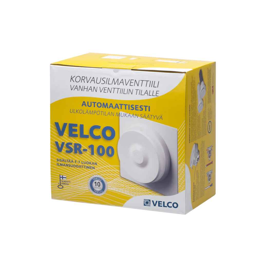 Velco VSR-100 on vanhan venttiilin tai rautaluukun tilalle asennettava, automaattisesti ulkolämpötilan mukaan säätyvä korvausilmaventtiili. Korvausilmaventtiilin toimintavarma vahatermostaatti säätää sen avausta ulkolämpötilan mukaan torjuen vetoa ja parantaen ilmanvaihdon energiatehokkuutta.Pakkaus sisältää asennuslevyn, jolla voi peittää mahdolliset vanhan venttiilin seinäpintaan aiheuttamat jäljet. Tuote sopii kohteisiin, joissa on painovoimainen tai koneellinen poistoilmanvaihto. Jos vanha läpivientikanava on Ø 95-100 mm, voidaan vanha venttiili poistaa ja asentaa VSR-100 suoraan sen tilalle.