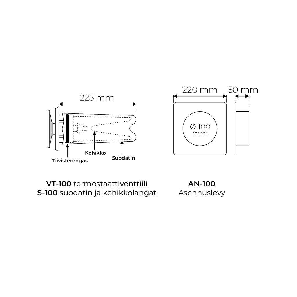 Sisältö: VT-100 korvausilmaventtiili termostaatilla, S-100 suodatin ja kehikkolangat, AN-10 asennuslevy, asennusliima ja asennusohje