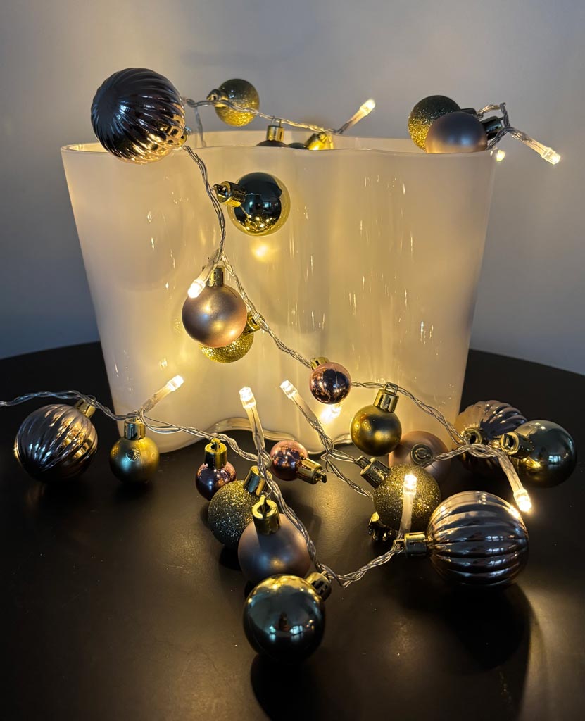 Juhlava koristesarja monipuoliseen somistamiseen. Ledien lisäksi sarjaa koristavat 48 palloa, joista osa kultaisia, kimaltelevia, ruusukullan sävyisiä tai vaaleanpunaisia, isompia, pienempiä, sileäpintaisia ja poimutettuja - upea kokonaisuus! Soveltuu sisäkäyttöön.
