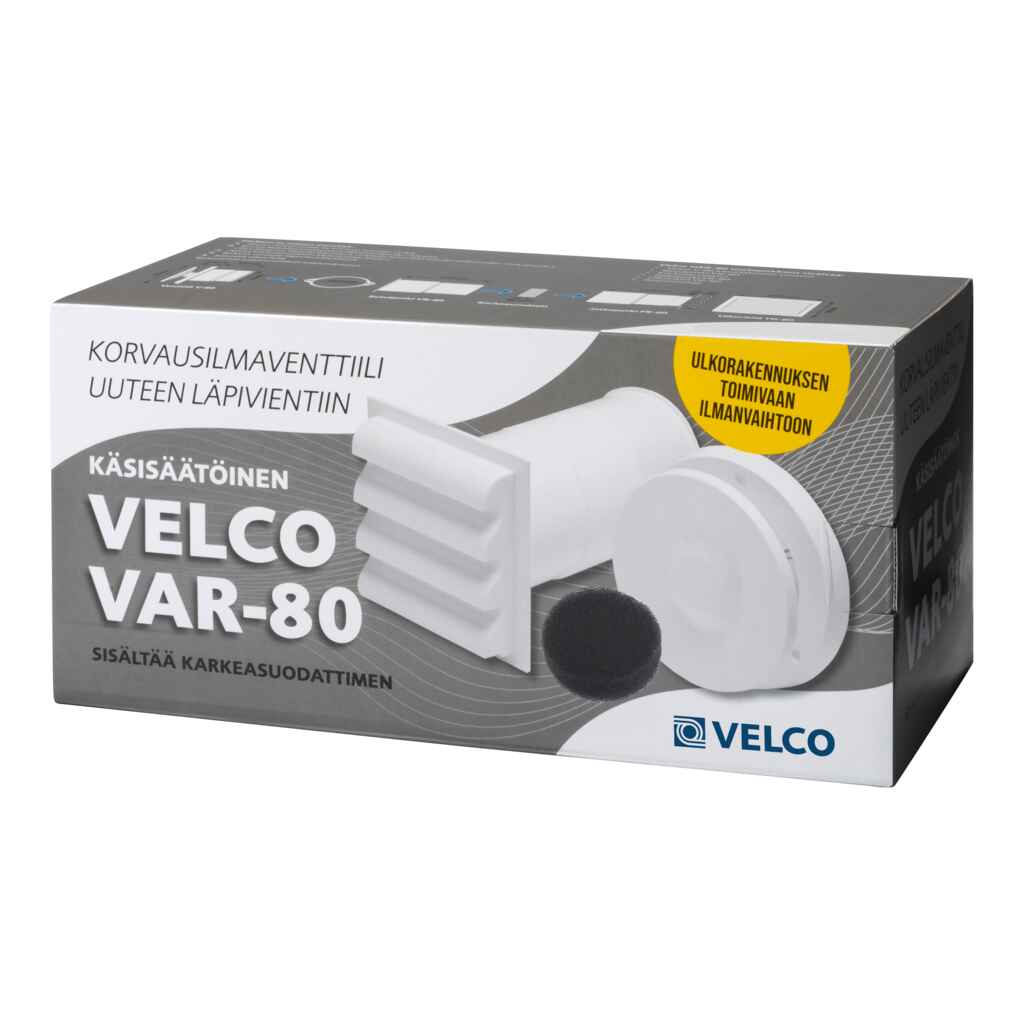Velco VAR-80 on käsisäätöinen korvausilmaventtiili, jonka avausta voidaan säätää portaattomasti. Se sopii ilmanvaihdon parantamiseen asumattomissa tiloissa. Suositeltuja asennuskohteita ovat piharakennukset, kuten varastot, aitat, puuliiterit, ulkohuussit sekä muut asumattomat tilat, joissa tarvitaan ilmanvaihtoa torjumaan tunkkaisuutta ja poistamaan kosteutta. Velco VAR-80 korvausilmaventtiili ei sisällä termostaattia. Asuinrakennuksiin suositellaan termostaatilla varustettuja venttiilimalleja tehokkaammalla suodattimella. Asennusreiän suositeltu halkaisija on Ø85 mm.