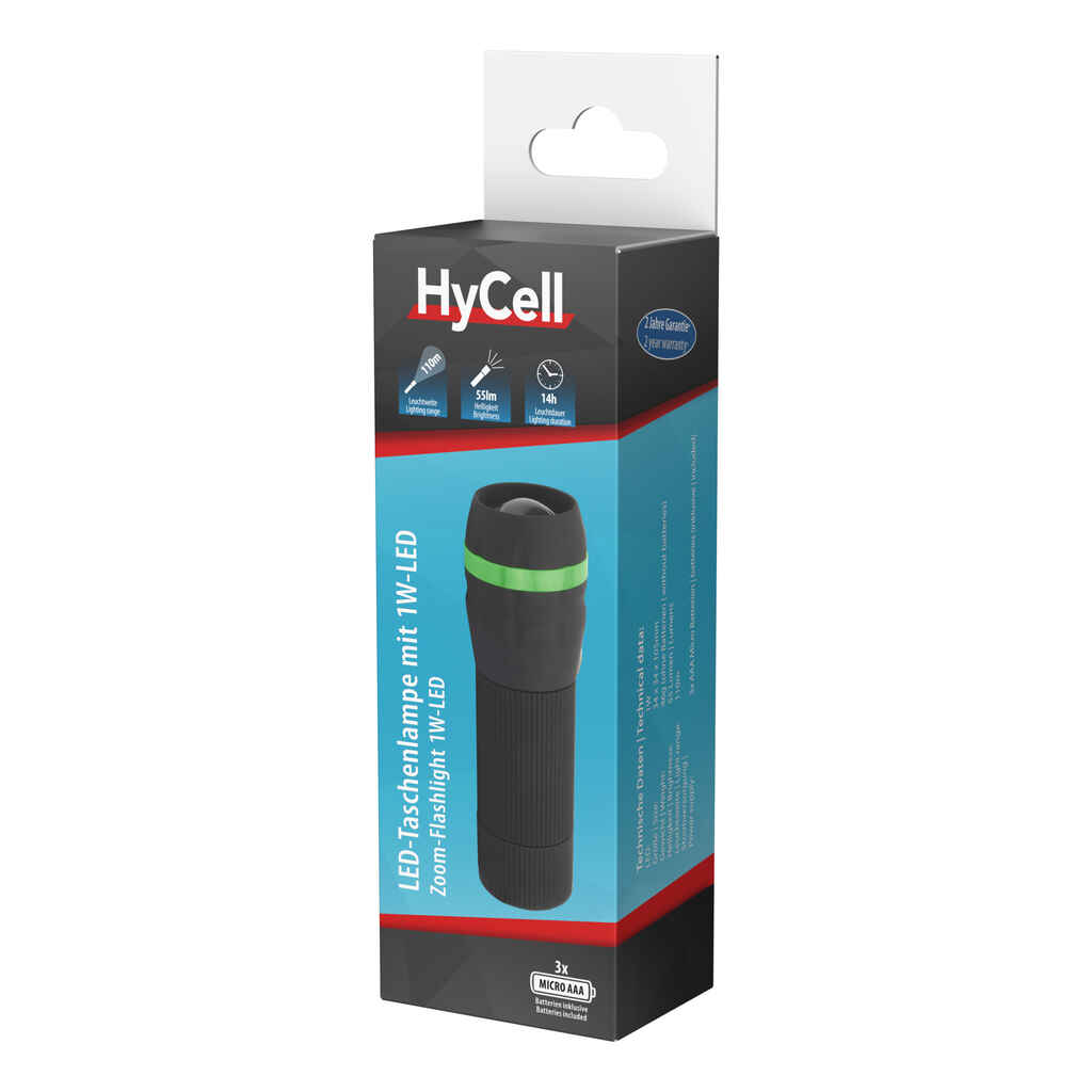 Näppärä Hycell LED-taskulamppu 1W LEDillä. Toimii 3xAAA paristoilla (mukana paketissa). ABS-muovia kumimaisella päällysteellä (pysyy helposti kädessä). Valon Zoom-toiminto. Rannenauha. On/off kytkin taskulampun perässä. Tyylikäs vihreä ’hehkuva’ ympyrä taskulampussa. Valon kantomatka noin 110 m. Toiminta-aika noin 14 tuntia yksillä paristoilla. Kirkkaus jopa 55 lumenia.