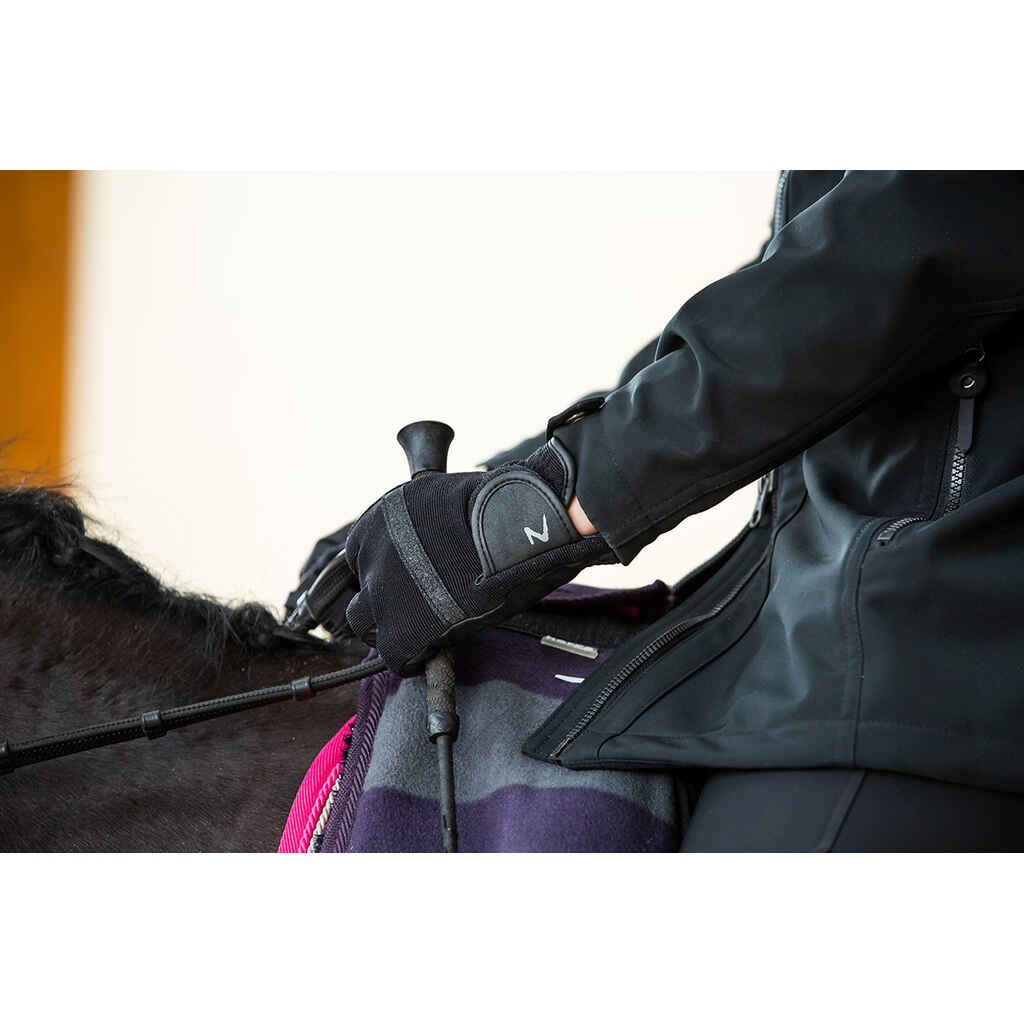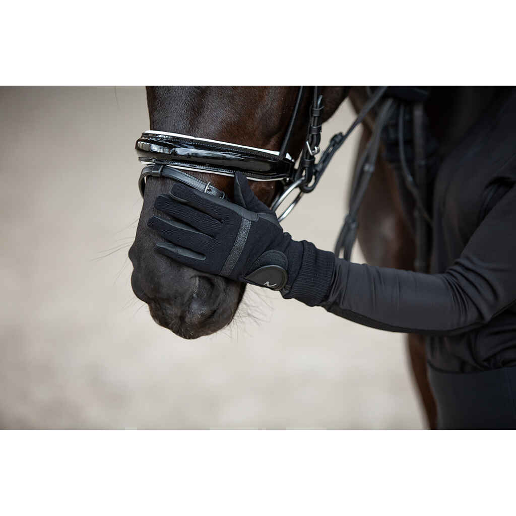 Klassisen tyylikkäät talviratsastuskäsineet on valmistettu miellyttävän joustavasta materiaalista ja kämmenpuolen keinonahka lisää pitoa. Tyylikkäät kimallesomisteet tuovat ripauksen eleganssia kokonaisuuteen. Säädettävä tarrakiinnitys ja joustava resori varmistavat, että talviratsastushanskat istuvat mukavasti käteen. Lämmin vuori ja likaa hylkivä pintamateriaali.