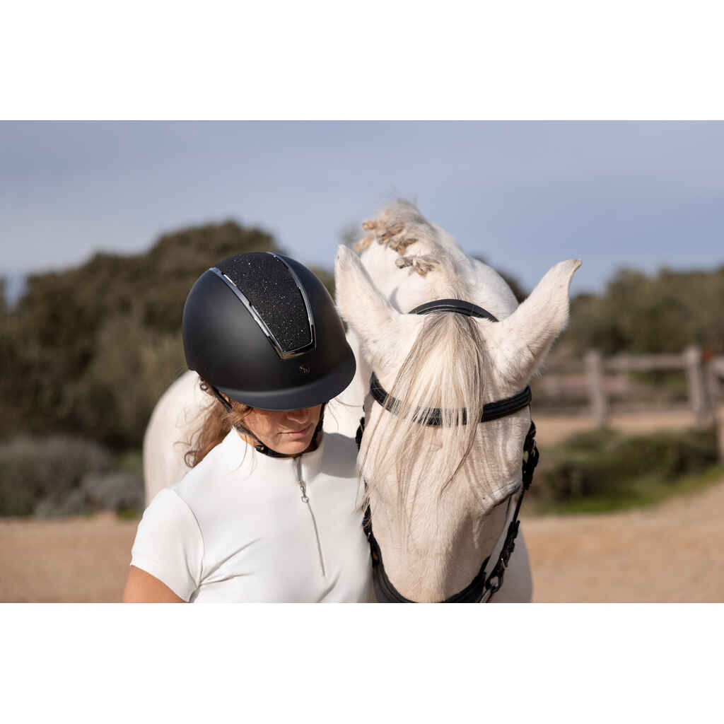 Elegantti Horze Aurora ratsastuskypärä tarjoaa erinomaista käyttömukavuutta ja sopii näin ollen hyvin myös aktiivisille ratsastajille. Kypärässä on huolella suunnitellut ilmanvaihtoaukot sekä tavallista suurempi visiiri, joka suojaa niin auringonsäteiltä kuin sateeltakin. Memory foam -pehmustettua kypärää on erityisen miellyttävä käyttää myös pidempiä aikoja. Mattapintaisen kypärän keskiosan glitterpaneeli tuo ripauksen säihkettä treenikentille.