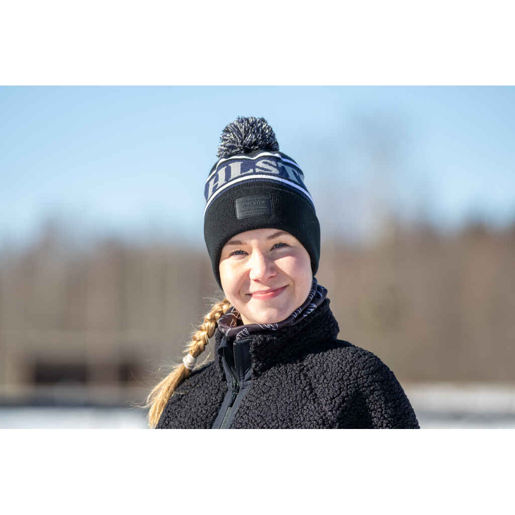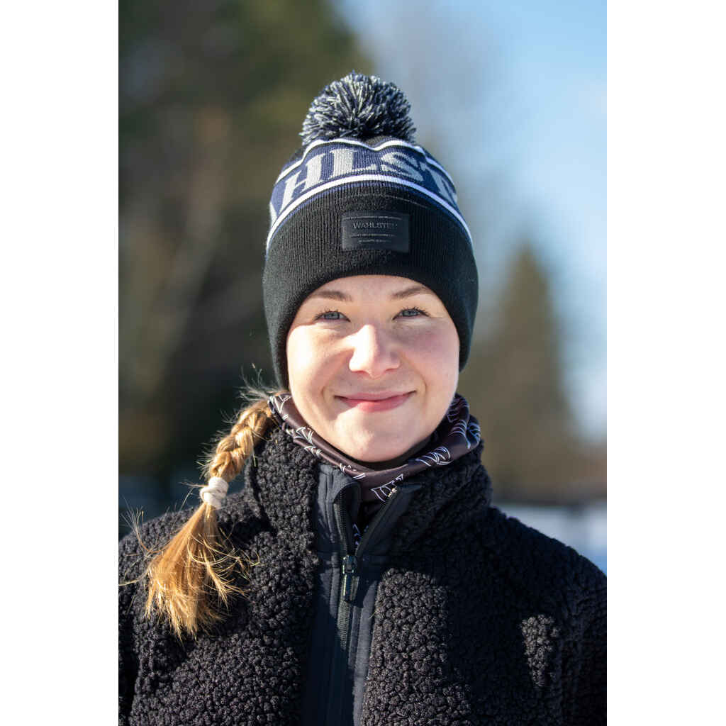 Klassinen leikkisä tupsupipo kääntöreunalla. Pipossa on suuri Jaquard-kudottu Wahlsten-logo sekä pienempi logo pipon etuosassa. Tupsupipon värityksenä aina yhtä tyylikäs musta-valko-tummansininen.