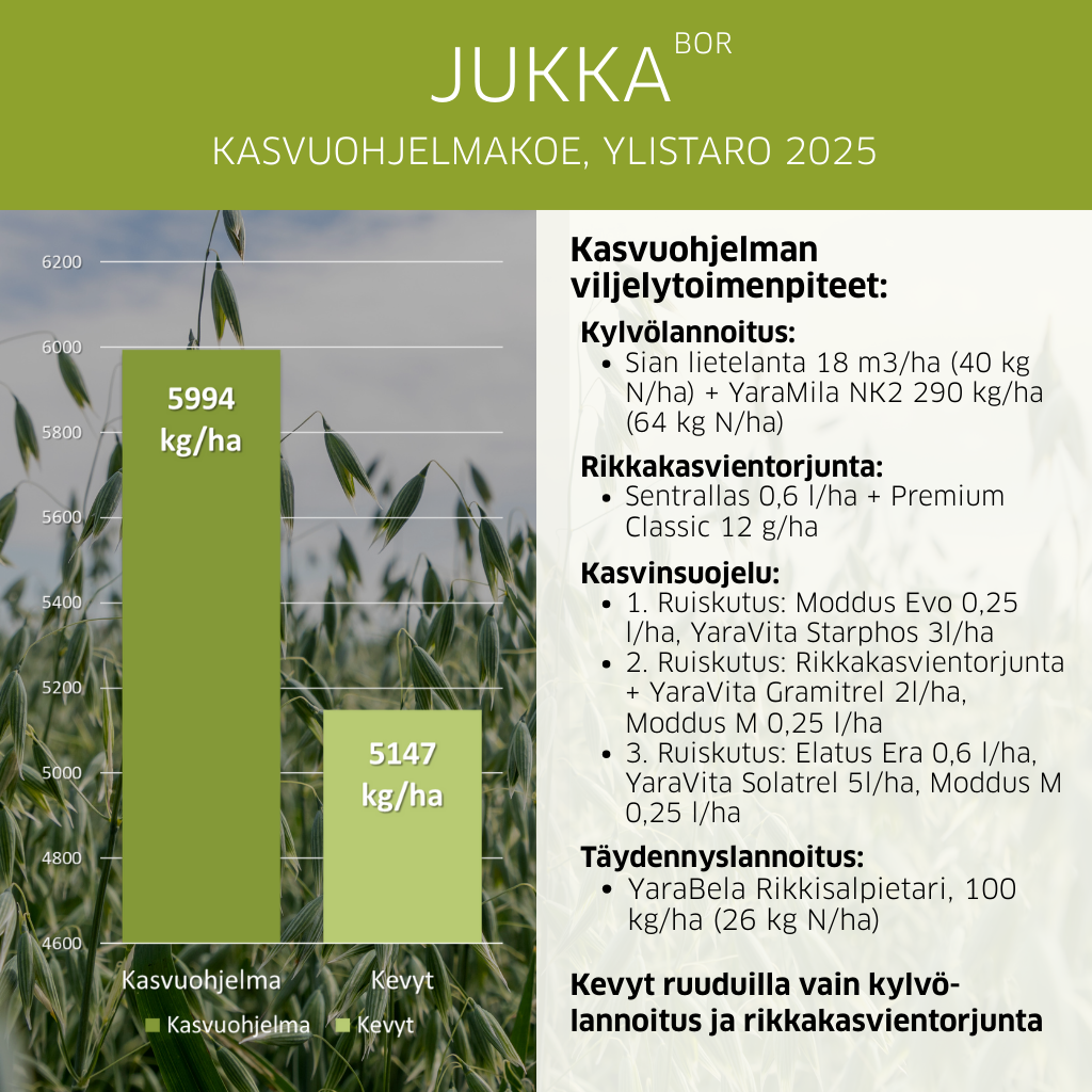 Jukka on aikaisten kaurojen satokärki ja Niklakseen verrattuna 10 % satoisampi (viralliset lajikekokeet 2015-2022). Erityisen hyvin Jukka on viihtynyt Pohjanmaalla, karkeilla kivennäismailla sekä 2-vyöhykkeeltä Kainuuseen ulottuvalla alueella.