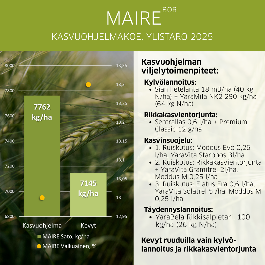 Kasvuaika huomioiden Mairen sato on poikkeuksellisen hyvä. Maire on testattu virallisissa kokeissa 2019-2021 ja tulokset kaikkina vuosina osoittavat Mairen poikkeuksellista aikaisuuden ja satoisuuden yhdistelmää. Maire on satoisampi tai yhtä satoisa kuin sitä useita päiviä myöhäisemmät lajikkeet.