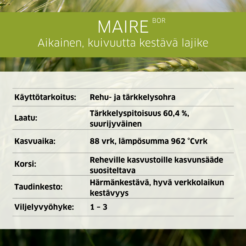 Maire on melko aikainen kaksitahoinen ohra. Virallisten lajikekokeiden mukaan sen kasvuaika on 962 tehoisan lämpösumman astetta.