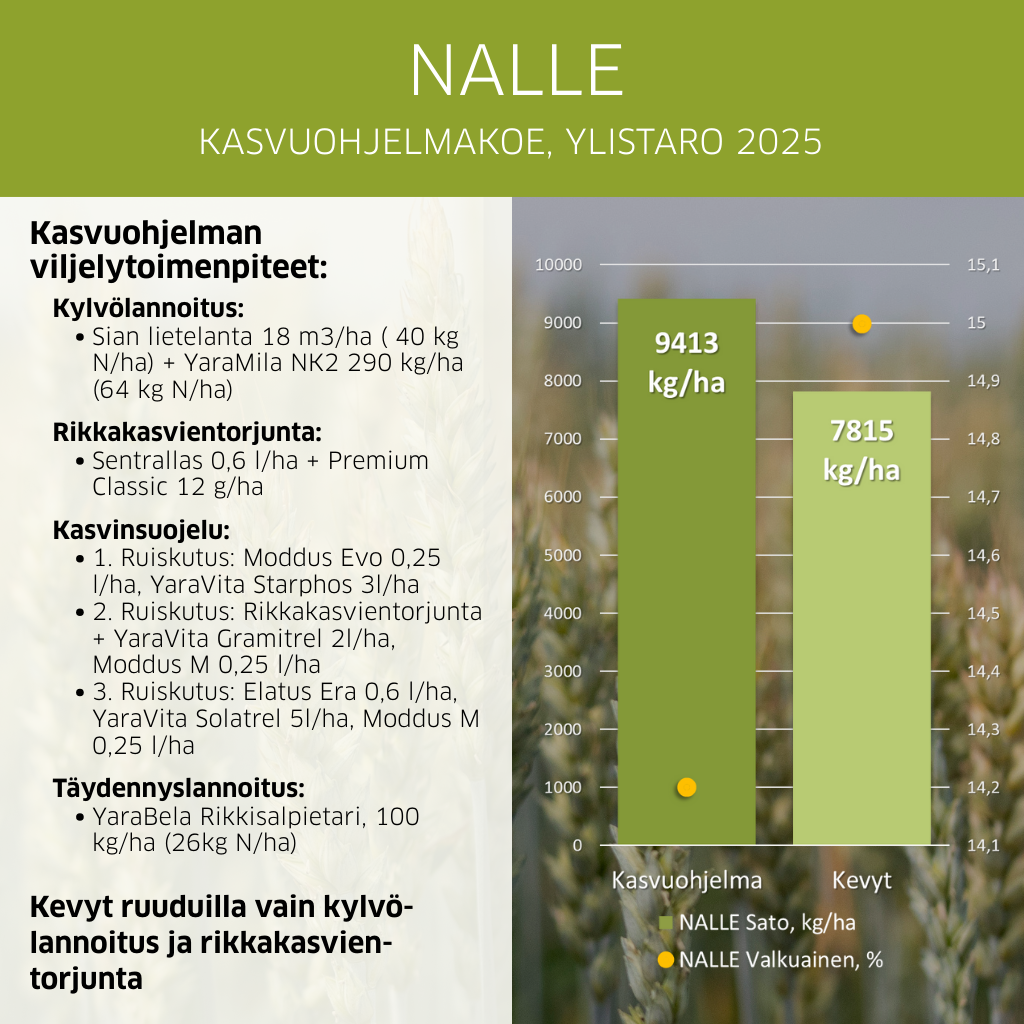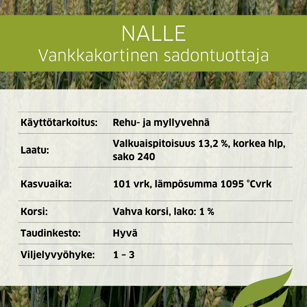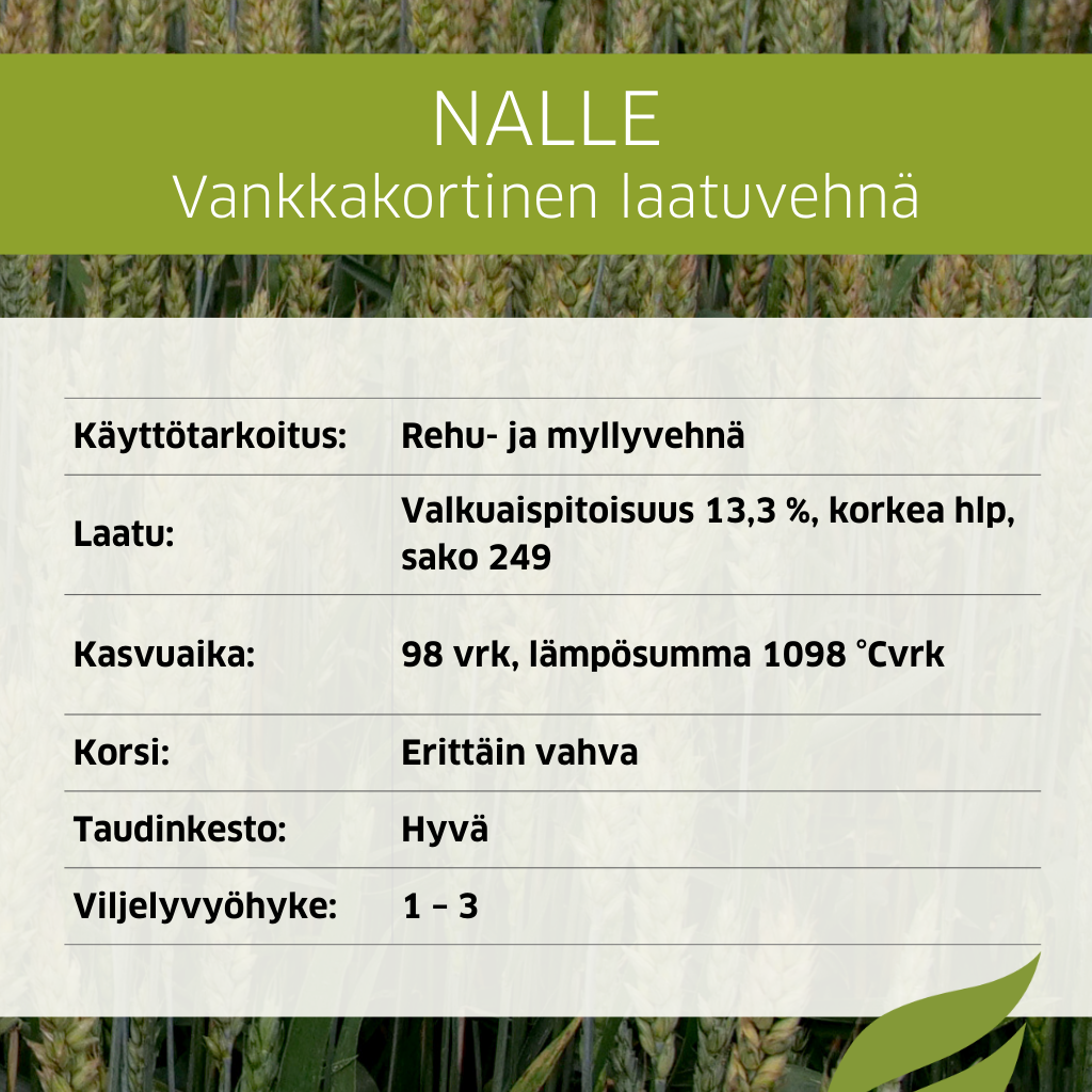 Erittäin korkea sadontuottokyky ja erinomainen laatu: valkuaispitoisuus 13,2 %, korkea hlp, sako 240. Nalle -vehnällä pystytään tuottamaan laadukasta myllyvehnäsatoa.