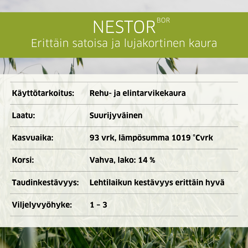 Huippusatoa myös haastavissa oloissa. Myöhäisten kaurojen aikaisimpiin kuuluva Nestor päihittää kilpailijansa monessa ominaisuudessa. Erittäin satoisa ja lujakortinen kaura, jonka laatuominaisuudet kestävät vertailun