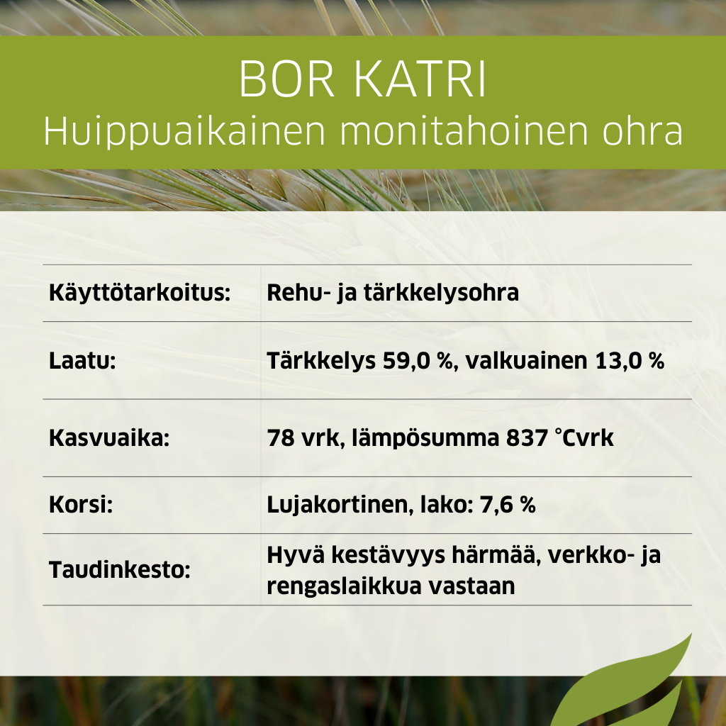 BOR Katri on erittäin aikainen monitahoinen ohra: kasvuaika 78 vrk, lämpösumma 837 °Cvrk. Sopii viljelyyn vyöhykkeille I-IV.