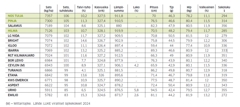 • Keskimääräinen sato 7357 kg/ha (106 % mittarilajikkeesta)