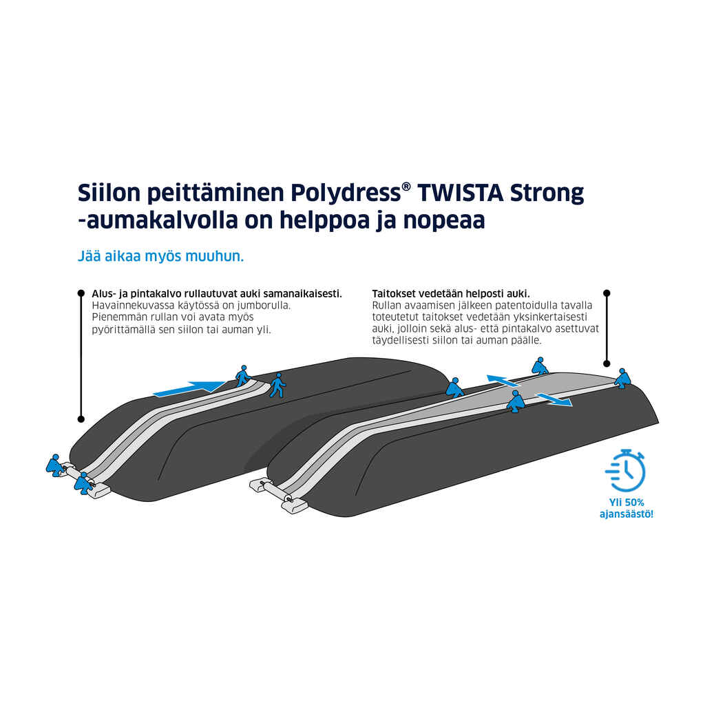 RKW Polydress® TWISTA Strong -aumakalvossa yhdistyy aluskalvo ja pintakalvo älykkäällä tavalla. Erillisten pinta- ja aluskalvon patentoitu taitto takaa erittäin helpon kalvojen levittämisen yhdellä kertaa. Säästät siis puolet kalvojen asennusajassa, eikä sinun tarvitse talloa ohutta aluskalvoa pintakalvoa asentaessasi. RKW Polydress® Strong -aumakalvossa on 18kk UV-suoja ja molemmat kalvot ovat täysin kierrätettäviä ja ne voidaan kierrättää samassa jakeessa.