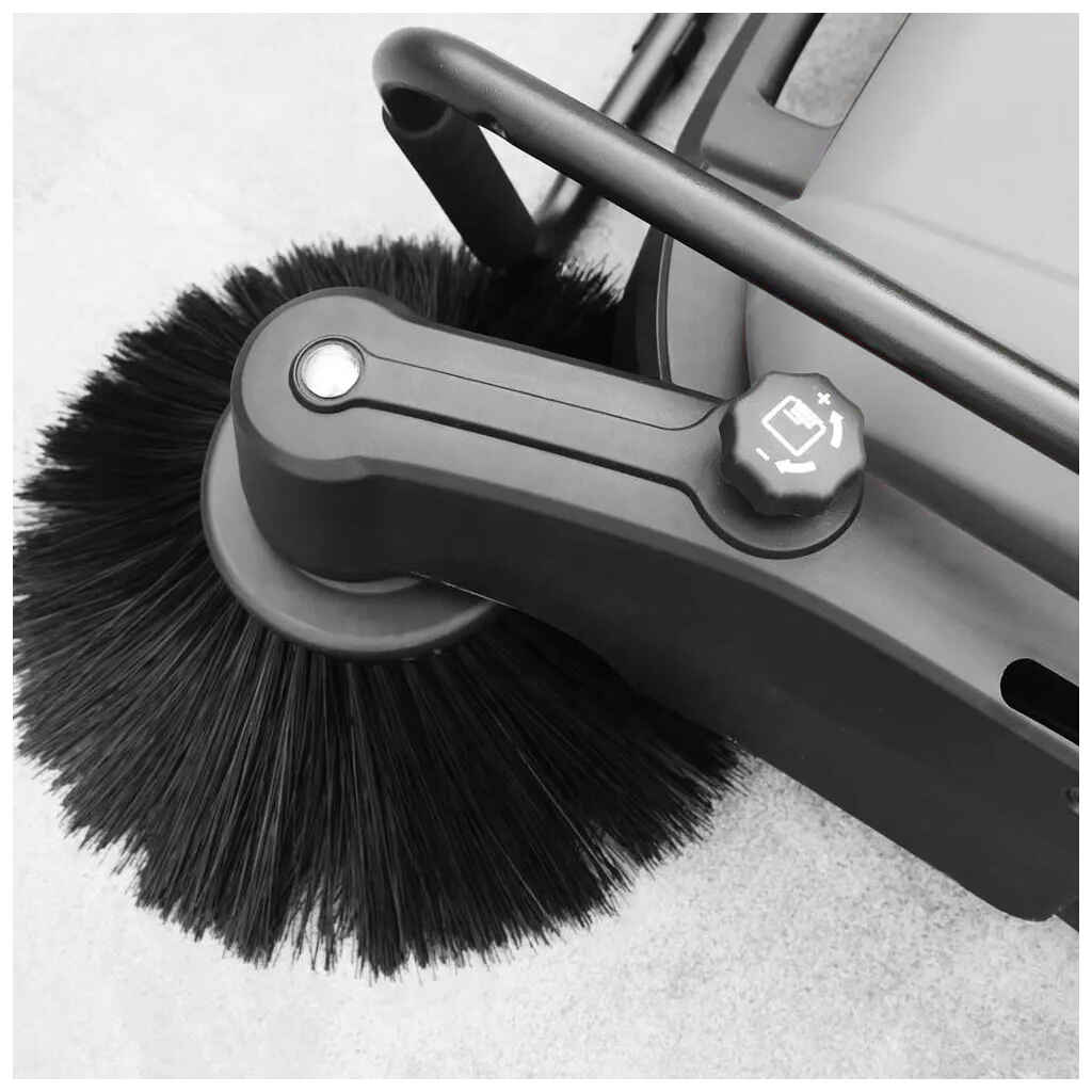 Ergonominen ja mukautuva: Portaattomasti säädettävä työntökahva sekä korkeussäädettävät lakaisuharjat (sivuharjat sekä alatelaharja), jotka voidaan säätää eri alustoille ja materiaaleille sopiviksi