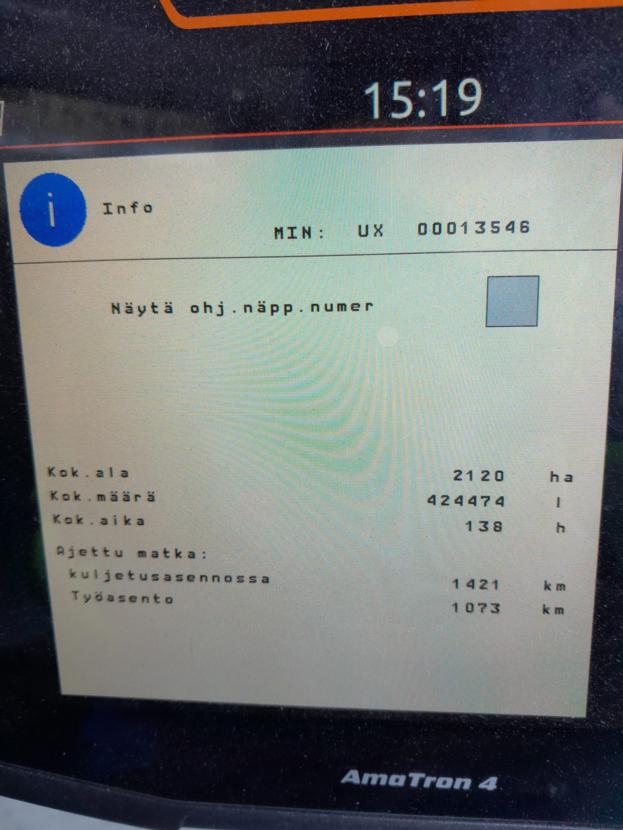 Myynnissä asiakkaan lukuun. 2120 ha ajettu. Samalla omistajalla uudesta saakka. Säilytetty lämpöisessä tallissa talvet. Amatron 4 terminaalilla ja lohkoautomatiikalla varustettu hienokuntoinen ruisku.