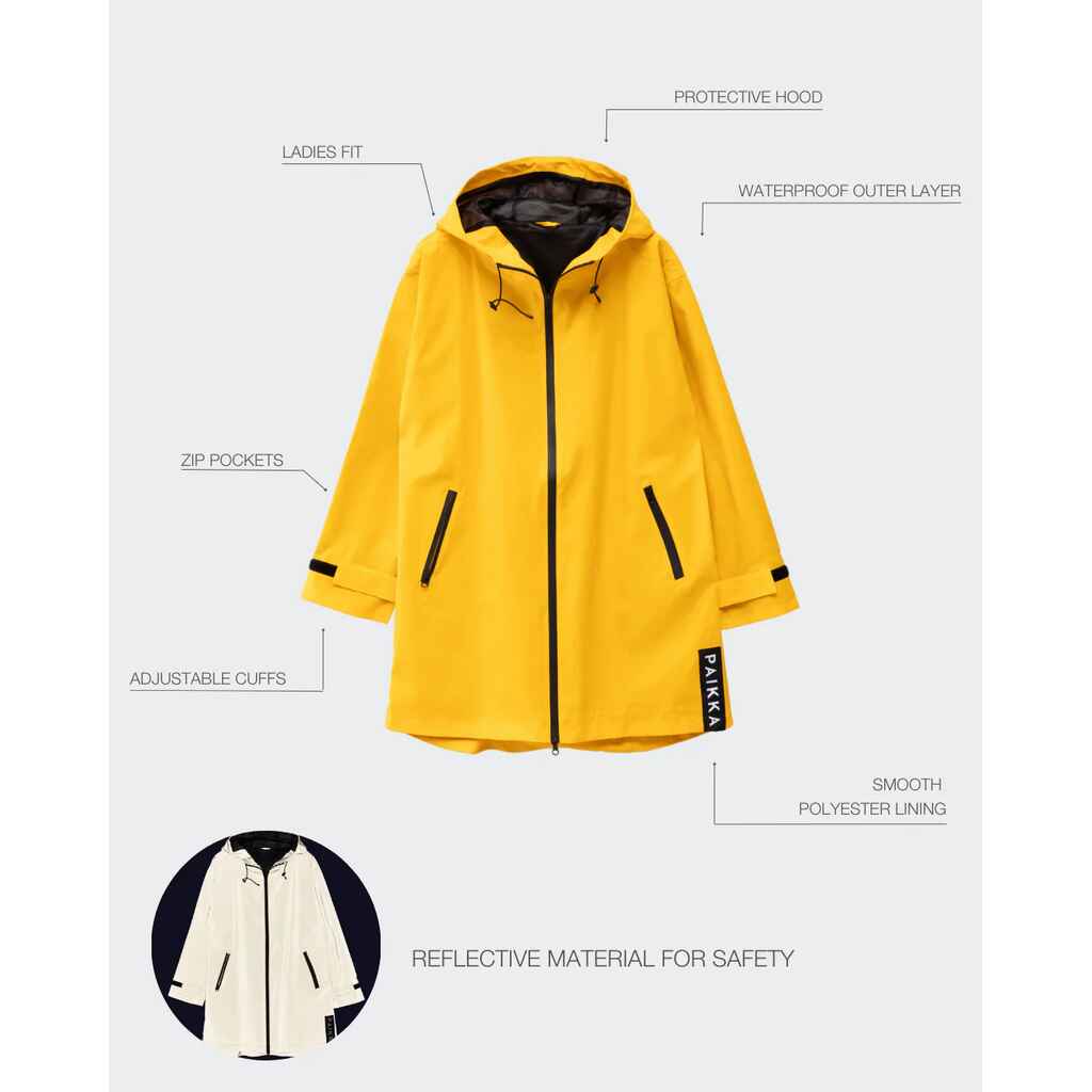 Paikka sadetakki ei ole ainoastaan tyylikäs, vaan se on myös suunniteltu äärimmäisen käytännölliseksi. Vedenpitävä kangas pitää kuivana ja lämpimänä, ja heijastava pinta loistaa pimeässä kirkkaana varmistaen näkyvyyden autoilijoille. Takissa on iso, säädettävä huppu, joka tarjoaa lisäsuojaa sääolosuhteilta. Väreinä keltainen ja tummanharmaa.